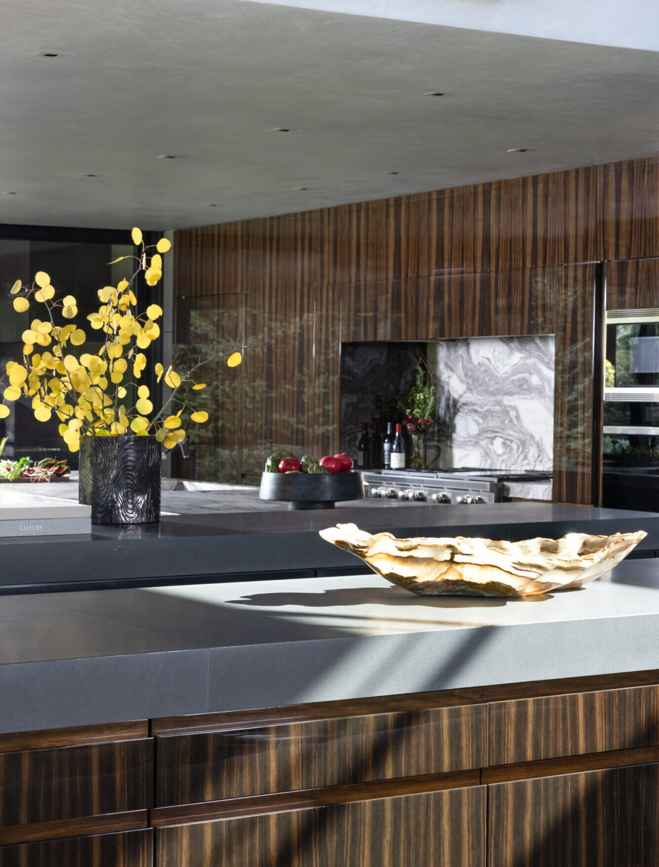 Harmoniously immersed in the Rocky Mountains of Colorado, this contemporary, elegant home was designed and built to maximize views of the surrounding natural beauty. Floor-to-ceiling windows throughout the home flood the interiors with light, highlighting interior finishes of Basalt stone, fumed eucalyptus, and custom hand-textured plaster walls.